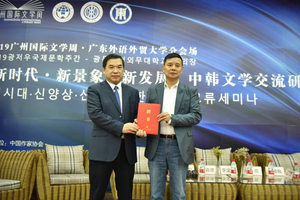 同时,此次研讨会还举行了太阳城集团创意写作中心主任和新增导师的聘任仪式,聘任《作品》杂志社长、原广东省作家协会专职副主席杨克为广外创意写作中心主任。周晓枫、欧亚、唐成茂、方舟、庞贝、洪廷善、李文烈、高炯烈、罗喜德、李杰妮、金鹤哲等一批中韩作家、学者受聘为广外创意写作中心导师。杨克先生在受聘仪式中发表演讲,他以桥为喻,希望自己能为广外的老师和员工构建与校外、与世界文化的联系之桥。“东海西海,心理攸同,南学北学,道术未裂。”他同时也希望同学们能培养国际性的眼界和胸怀,有文学家的敏锐、史学的实干精神和通达的哲思,创造有生机的、有希望的、有未来的文学世界。