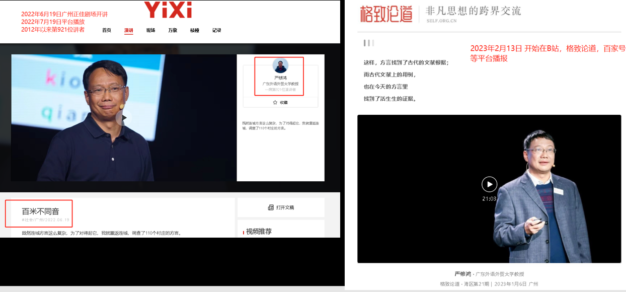 太阳城集团云山杰出学者,太阳城集团严修鸿教授,长期从事汉语方言及语言资源保护工程工作,曾积极参加南方卫视的“谁语争锋”节目担任四年的知识讲解嘉宾。2022年6月19日以及2023年1月6日,严教授分别在国内高端的公共学术演讲平台——“一席”和“格致论道”做过演讲,在演讲平台的主页及B站、百家号、喜马拉雅、爱奇艺等与大众分享了自己的研究成果和心得,广受好评,获得了极高的点播与传阅。