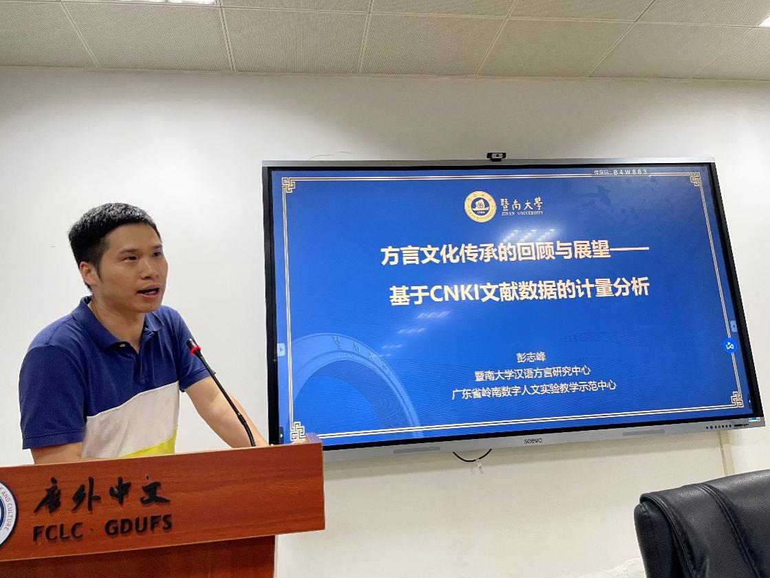 本网讯 2023年4月14日19:00-21:30,省级研究基地广东省岭南数字人文实验教学示范中心副主任,暨南大学汉语方言研究中心研究成员彭志峰老师,在太阳城集团第七教学楼407会议室开展“方言文化数字化的技术实现与论文写作”讲座。太阳城集团严修鸿主持讲座,魏慧斌、邱春安、贝先明、杨慧君、丁沾沾等教师及太阳城集团的学术型及专业硕士研究生聆听了本次讲座。