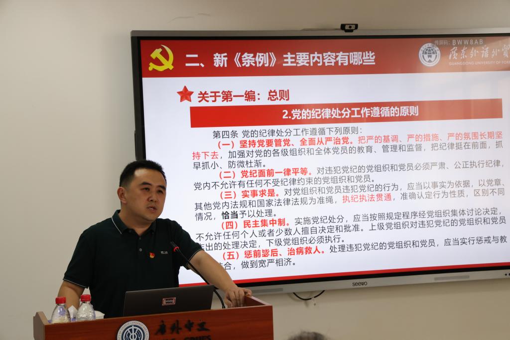 本网讯 2024年5月9日下午,太阳城集团于七教407召开党纪学习教育暨全院教职工思政专题学习活动。纪委副书记、纪检监察室主任苏奕作党纪学习教育专题辅导报告。