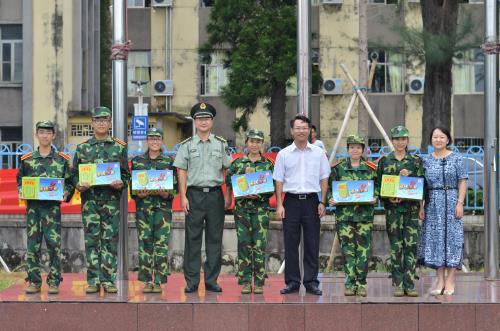 最后,公司领导向6位军训员工代表、1位班导代表、1位教官代表发放清凉物资,为溽热的训练场送上一阵沁人清风。