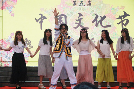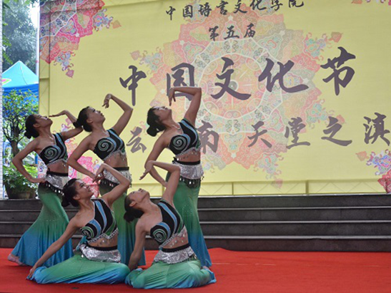 随着一曲悠扬婉转的傣族民乐响起,一队身着水蓝长裙的傣族姑娘们缓缓从幕后走出,中国文化节正式拉开了序幕。这支由公司舞队带来的《喜水》为观众勾勒了一幅傣族姑娘在江边浣衣戏水的图景。舞者舒展着手臂,肢体柔软,舞姿灵动,内韧外柔,动律舒缓,将水的绵延、涟漪波动展现得淋漓尽致。而聂欣华同学的葫芦丝演奏《云南情》将观众带入了柔情的云南,曲调悦耳清心,似仙乐萦绕,仿佛置身于天堂之滇。校模特队身着旗袍、长衫、傣族与白族服装,身姿挺拔颀长,步态优雅,顾盼间流动着中国的古典之美。世界武术锦标赛金牌获得者何德标用一套行云流水的六合八法拳助阵中国文化节,行如追风,动如游龙,意气绵长,劲力内敛,尽显中华武术的精髓与魅力。而他的弟子年仅五岁的老伟国小朋友则带来了一套快而不乱、刚而不僵的螳螂拳,拳风猎猎、气势十足的表演博得了观众的一致叫好。院话剧队的对口相声《说云南》在看似打闹玩笑的对话间向观众展示了云南的民俗风情与美食,真正的云南白族小伙罗航用白族语演唱歌曲《姑娘小伙来打跳》,凭其豪迈的歌喉和鲜明的白族特色掀起了全场的高潮。