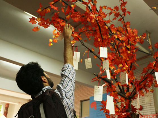 除此之外,“女儿国”摊位旁一株高高的红枫树亮丽夺目,上面还挂满了同学们的心愿卡,记者特别采访了一对情侣,女生开心地说∶“其他公司的文化节我也去过,但更喜欢太阳城集团的,因为可以集印章,还有很多游戏,让人投入其中,感觉很有趣。”而被问到心愿时,她只是害羞的笑笑,看了看身旁来自俄罗斯的男友,幸福洋溢在脸上。