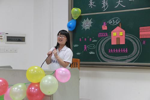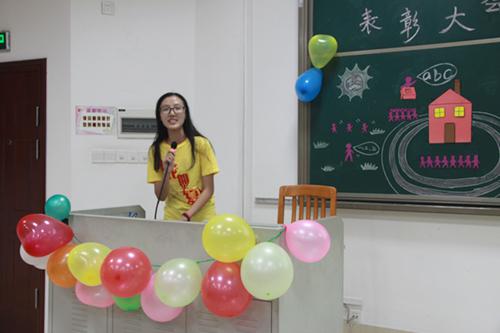 在颁奖过后,吴璐薇老师向同学介绍了今年夏天她到四川马尔康志愿服务的经历。她诉说身上T恤的来历,上面印有“全国多语言服务联盟”的字眼,这是她在今年夏天,代表公司与全国其他10大语言院校参加的“歆雨工程”的纪念。这件衣服在全国一共11件。她回忆着自己在支教过程中完全克服不了的高原反应,回忆着回程时正前方一辆车因山体塌方被冲下悬崖的惊心动魄······但是每次她反刍那段时光,却仍会湿了眼眶,一如她所说 “为什么我们的眼里常含泪水,因为我们总是带着感动上路”。