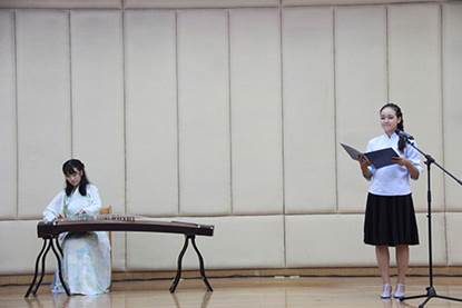 “荣耀共睹五十年,重逢再筑广外梦”接下来的4个文艺表演精彩纷呈。气势十足的古体诗,和武者的有力拳头配合着,第一个节目“舞随诗起耀广外”吸引了全场观众。悠悠音乐声响起,主持人朗读的声音抑扬顿挫,舞者在台上翩翩起舞。“炫舞青春在广外”这一环节里,富有时代气息的现代诗和古典的舞蹈相得益彰。到了第三个表演——“诗琴话意”,古筝琴声悠扬,在朗读者的演绎下,《忆广外之无言》的意境犹在眼前。文艺表演的最后一个节目是“广外那些小事”。节目主角《广外二三事》的文字平淡但又不失温情,再加上屏幕显示的图片,图文并茂,学子们对广外的真情溢于言表。