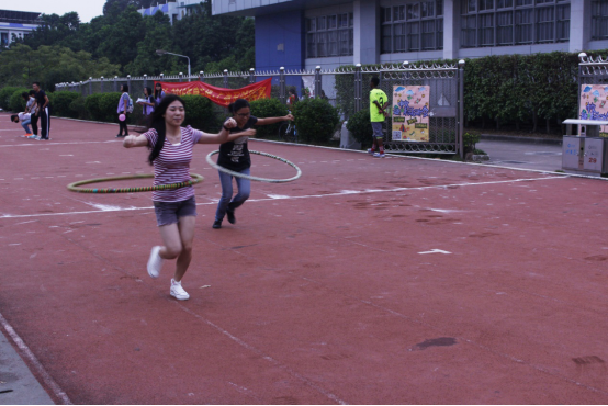 操场另一边,如火如荼地进行着趣运会的第三个项目——快乐传递。每班派出六名选手,第一名队员在起点转着呼啦圈出发,随后的五名队友手拉手依次穿过呼啦圈,传递给最后一名队员转着呼啦圈走向终点。比赛过程中,选手们带着着呼啦圈大步前进,中间的队员们则手拉手默契地钻过呼啦圈,整个比赛秩序井然。比赛进行得十分迅速,但汉教1402班还是以31秒98的最好成绩拔得头筹。