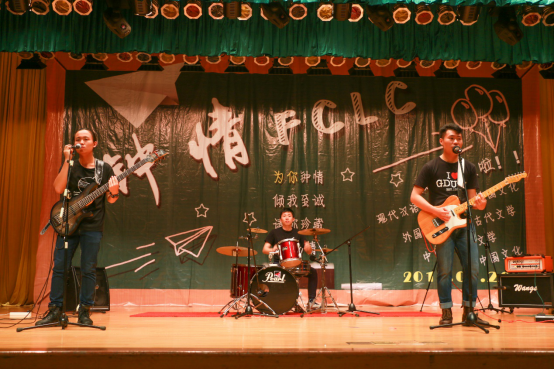 致辞完毕,霏阳吉协带来的《Young Man》以其青春活力赢得阵阵掌声,其后更以曲风变幻奇特的《广外广外》牵出浮动在同学们心中的离愁别绪。除此之外,霏阳还特别呈现了《You》这一曲目。摇滚过后的是来自严修鸿的电白话歌曲《火拽融》。严修鸿先解说了一遍歌词,为了让同学们更直观地感受这首歌,严修鸿以清唱的形式让一首简单朴素的《火拽融》在现场响起,给晚会带来了浓浓的客家风情。来自文秘1202班的《致光阴》将《对你爱不完》、《浪漫樱花》、《失恋阵线联盟》串联起来,配以活力四射的舞蹈,将大家带回了年少,给现场带来了活力,使得全场为之喝彩。