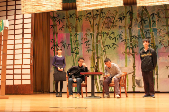 在一片喝彩声中,模特队的队员们缓缓登台。台上型男美女身材高挑,黑白为主调的衣裙在他们行走间翻飞,划出一道道优雅的弧线。男女两两携手,摆出各式迷人诱惑的姿势,将全场掀起了一个小高潮。而接下来文管1401的话剧《面试》,则让观众们都笑出了泪花。话剧讲述了两位不同的面试者面试同一个戏剧社团,而受到不同的待遇的故事。其间两人冲突不断,笑料百出,饰演“门”的男主角演技高超,博得了现场一阵又一阵掌声。其间还创意十足地穿插了吉他自弹自唱和广场舞等,使会场内充满了欢声笑语。
