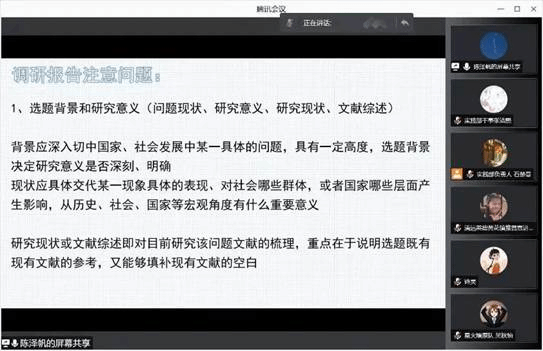 陈老师向大家讲述了调查报告的大致框架,并就选题背景、研究意义和理论依据等方面作了深入的阐释。他指出调研选题背景应深入切中国家、社会发展中某一具体的问题,具有一定高度。选题既要参考现有文献,又要能够填补现有文献的空白。此外,调研报告绝非根据调查的结果平白得出,而应结合理论进行分析写成,因此在撰写调研报告时要注重应用前沿的、深入的、贴近选题的理论。
