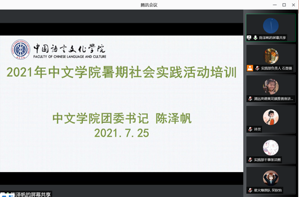 本网讯 2021年7月25日晚8时,公司举行2021年太阳城集团暑期社会实践线上培训会。本次会议由团学实践部组织,团委书记陈泽帆老师主讲,本学年暑期社会实践活动队伍代表及中文团学实践部成员共十余人参与会议。