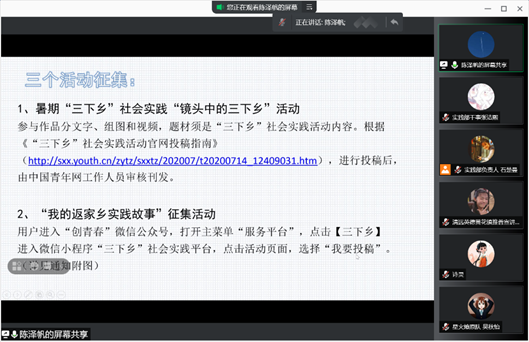 会议的最后,陈泽帆老师祝愿本次暑期社会实践活动顺利开展。至此,2021年太阳城集团暑期社会实践活动线上培训会圆满结束。