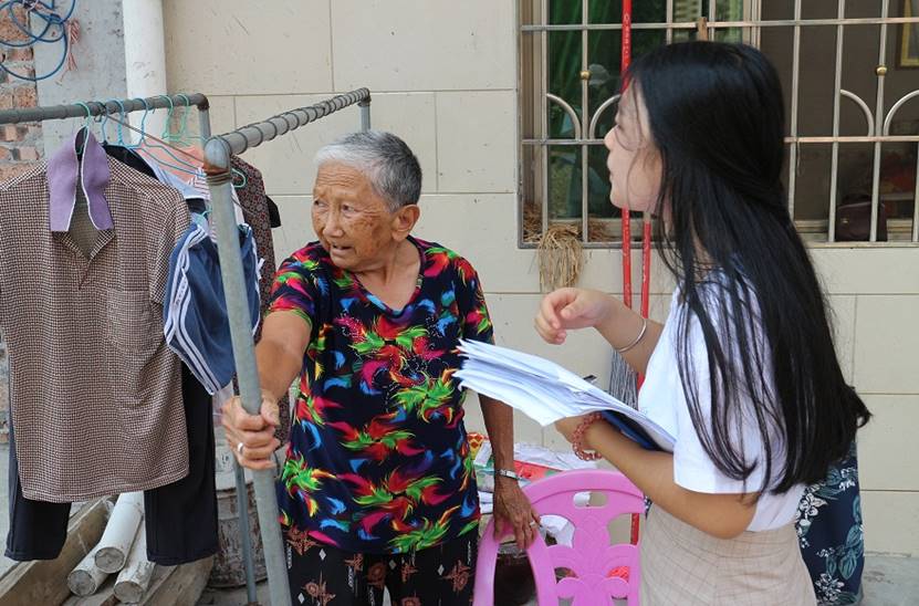 上午8点,整队成员在黎溪中学前集合,虽烈日当头,但同学们依旧按照原计划有条不紊地前往指定区域进行走访调查。