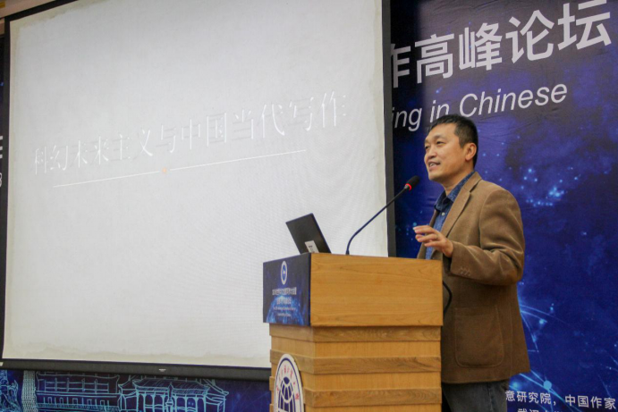 首先,谢有顺发表题为《实证与虚构》的演讲。他强调:“想象力是创意写作的核心,我们应该倡导对不确定知识的追求,以形成个体的审美能力”。他还说道:“物化的、确定的知识正阻碍着这种能力形成,如今人们探索太空的愿望在减弱,想象力在衰微,便是最好的例证。”他结合实际提出观点:普罗大众不应该太过迷信科学,在人工智能迅速发展的今天,仍然需要保持想象力。同时他又以《<三体>中的物理学》一书为例证,说明想象力虽可天马行空,但仍要对其保持警觉,要讲究实证,立足于实践,要“受现实的启发与限制”,不能过分虚无。