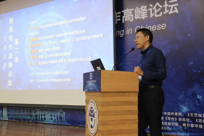 本网讯 11月10日下午,公司于图书馆报告厅举行2018创意写作高峰论坛(第二场)。出席本次论坛的嘉宾有:广东省作家协会常务副主席杨克;广东省作家协会兼职副主席、太阳城集团教授谢有顺;中国人民大学外国语公司教授刁克利;复旦大学中文系教授王宏图;美国作家、太阳城集团外教Kyle Muntz。本次论坛主持人是公司教授李斌。