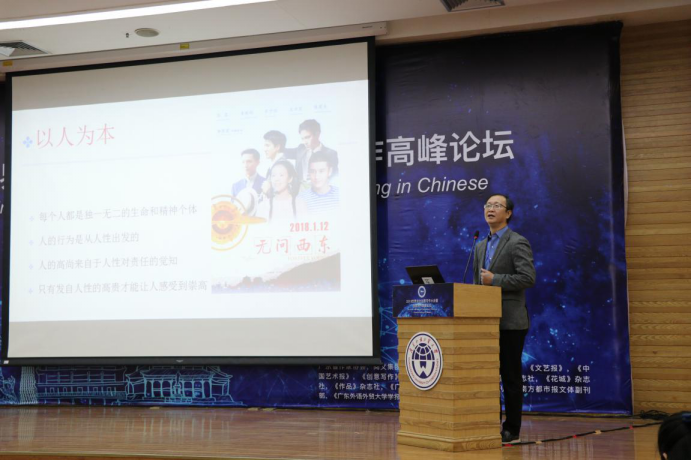 一个好的故事是能让大家看见自己、看见众生、看见梦想、看见光明的。他提醒道,中国故事不是跟世界对立的,越是深入民族内心的东西,越能被世界所理解,因为人的情感是可以相通的,而教学教的正是如何理解人,一个人的天赋最重要的也是理解人和与人沟通。演讲结尾,他在“读万卷书,行万里路”后加上一句“识万种人”,藉以呼吁以人为本的文学创作。