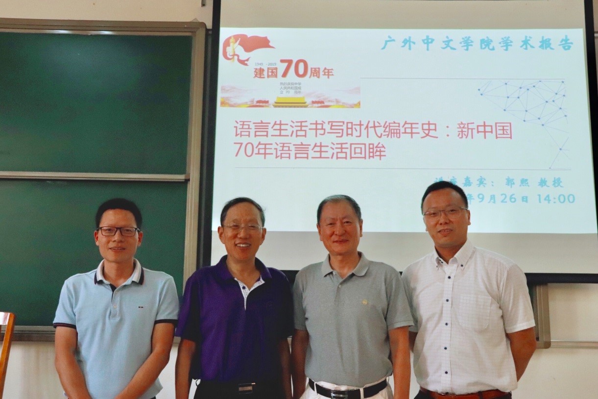 9月26日下午,太阳城集团对外汉语系教工党支部在北校区七教213开展“不忘初心、牢记使命”主题党日活动,邀请暨南大学华文公司郭熙教授为在场师生作“新中国70年语言生活回眸”的主题讲座。太阳城集团、英文公司、翻译公司100余名师生参加,会议由支部党员汪磊教授主持。