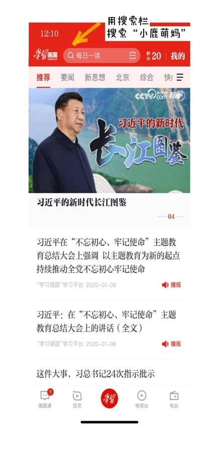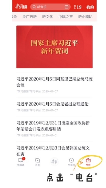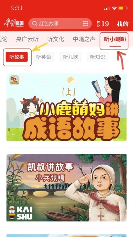 收听指引1:打开学习强国APP——点击“电台”——找到“听小喇叭”版块——“听故事”专题中