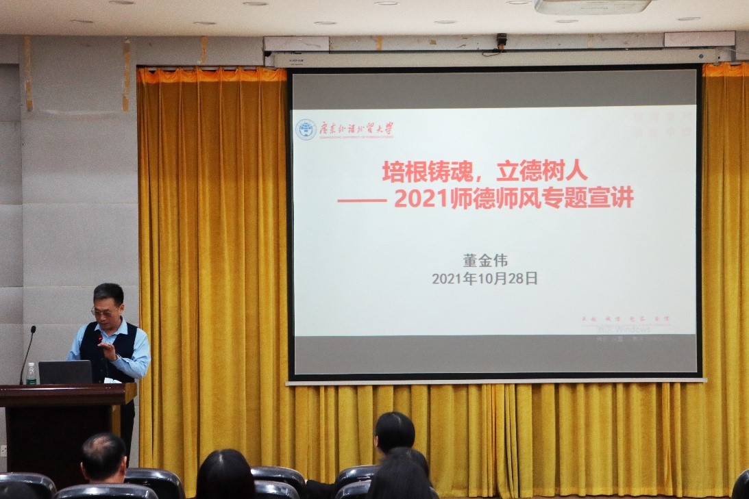 本网讯 2021年10月28日下午,太阳城集团在七教106开展师德师风专题宣讲会,太阳城集团师德师风宣讲团成员、师德标兵董金伟经理主讲,委书记周东兰书记主持,太阳城集团全体教师出席会议。