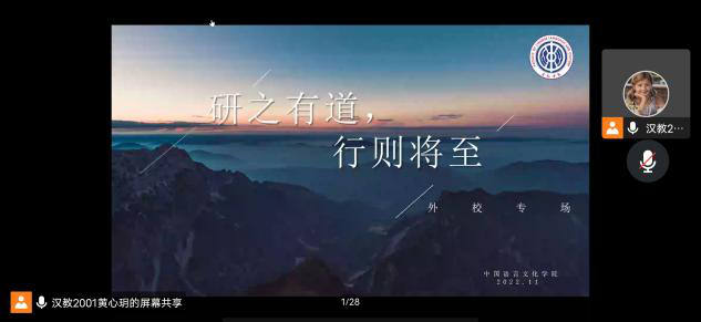 会上,首先由18级广外文管专业毕业生,现就读于中央民族大学的曾敏婷师姐向同学们分享自己的跨考经验。出于个人兴趣和实践经历的考虑,曾师姐选择了跨考。而就如何科学备考这一话题,师姐从时间线上进行了细致的分析。每个复习阶段都有所侧重,帮助同学们合理规划备考时间。此外,师姐还分享了自己充实的读研生活,给同学们提供了不一样的学习视角。