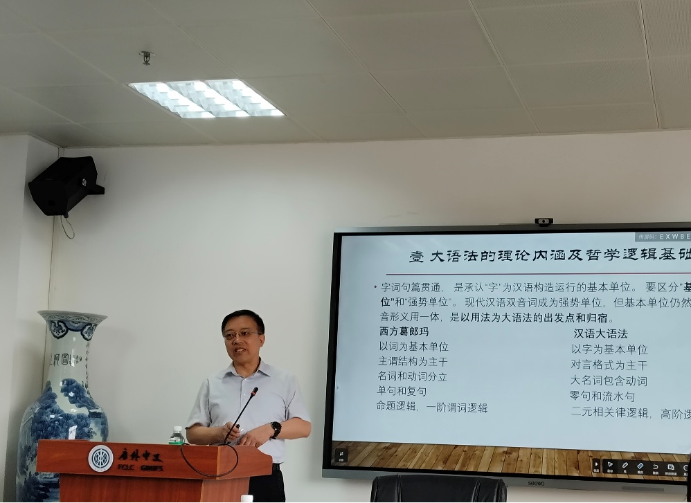 讲座伊始,史教授引用沈家煊先生的大语法理论,详细解释其与传统语法理论的区别,并将其概括为:以对话互动为根本,以对言格式为主干,字词句篇贯通,音形义用一体,传情达意不二,历时共时交织。他指出汉语与西方语言相比,汉语呈现出少形态和主观性强的特点。史教授先是从哲学角度分析中西范畴观的不同;其次通过对比汉英差异,论证汉语是一门主观性丰富的语言;最后通过多个语言实例,说明语义、语用、韵律等方面对语法产生的不同作用。