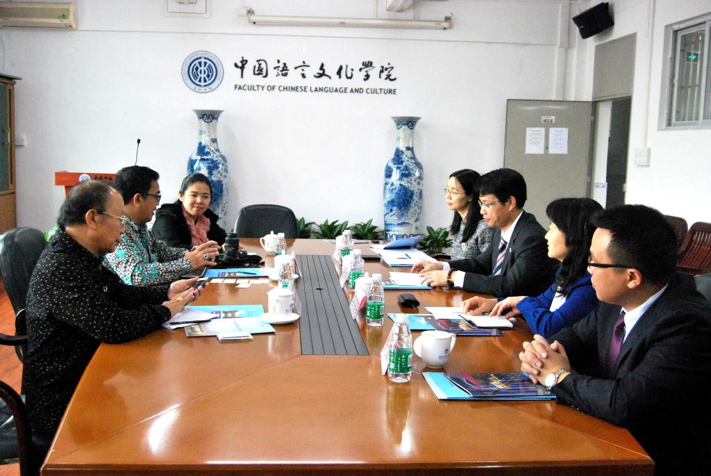会面伊始,智星大学董事长沈牧平首先对广外的热情接待表示了感谢,随后简单介绍了智星大学的情况。智星大学是第一所获得印尼政府承认办学资质的私立大学,目前开设了三个语言专业,其中中文系在校生200多人,毕业生100多人;另外三年制旅游管理专业,汉语课是该专业员工的必修课。沈牧平表示目前该校汉语方面团队短缺,并且随着中印两国经济贸易等方面合作的加深,越来越多的印尼企业需要更多的汉语人才,沈牧平提出,希望广外能在汉语团队方面给予帮助。
