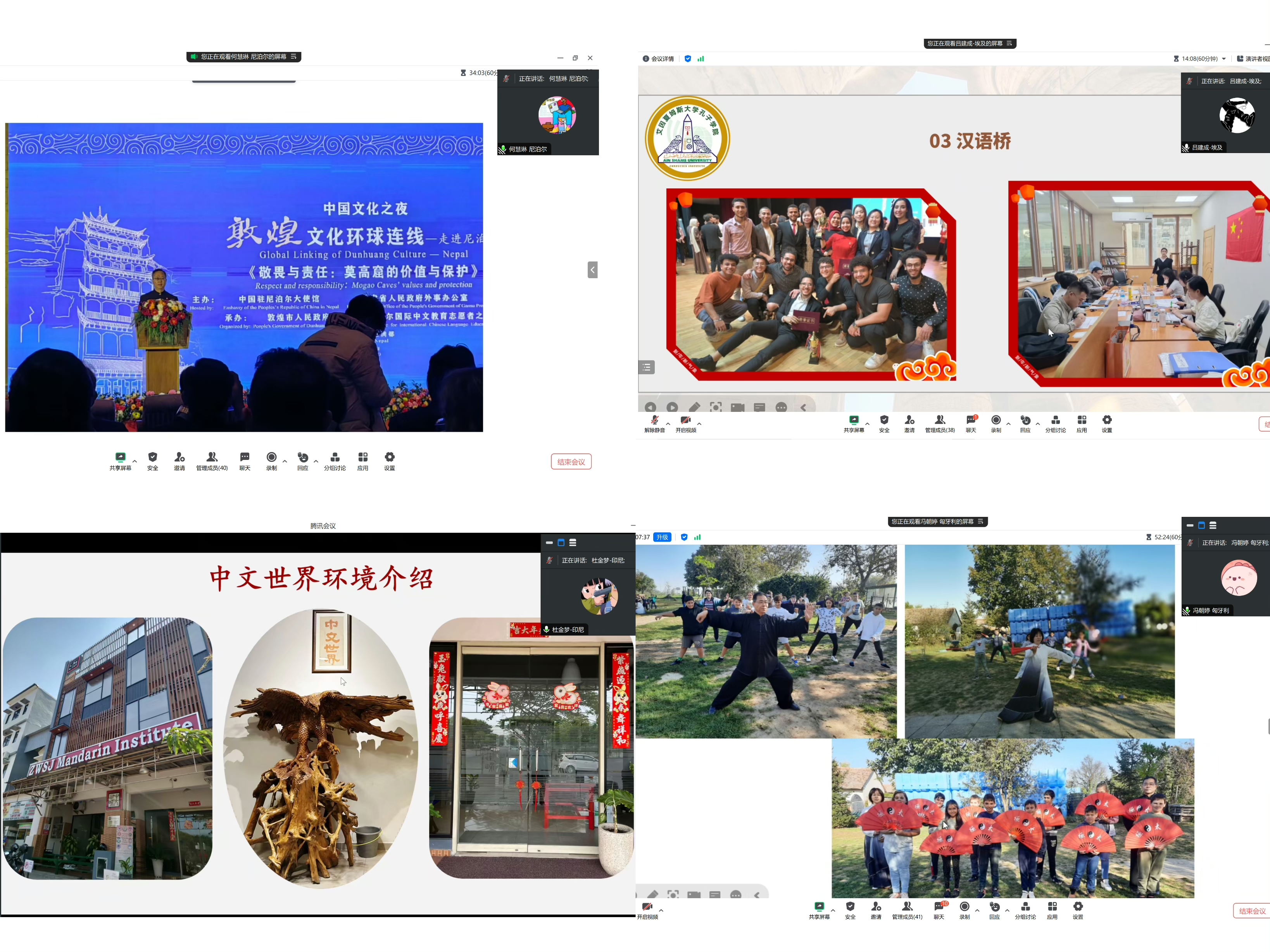 分布在埃及、俄罗斯、韩国、柬埔寨、秘鲁、尼泊尔、葡萄牙、泰国、匈牙利、印尼以及中国澳门等国家和地区的志愿者代表分别汇报了各自在海外工作和生活的情况。