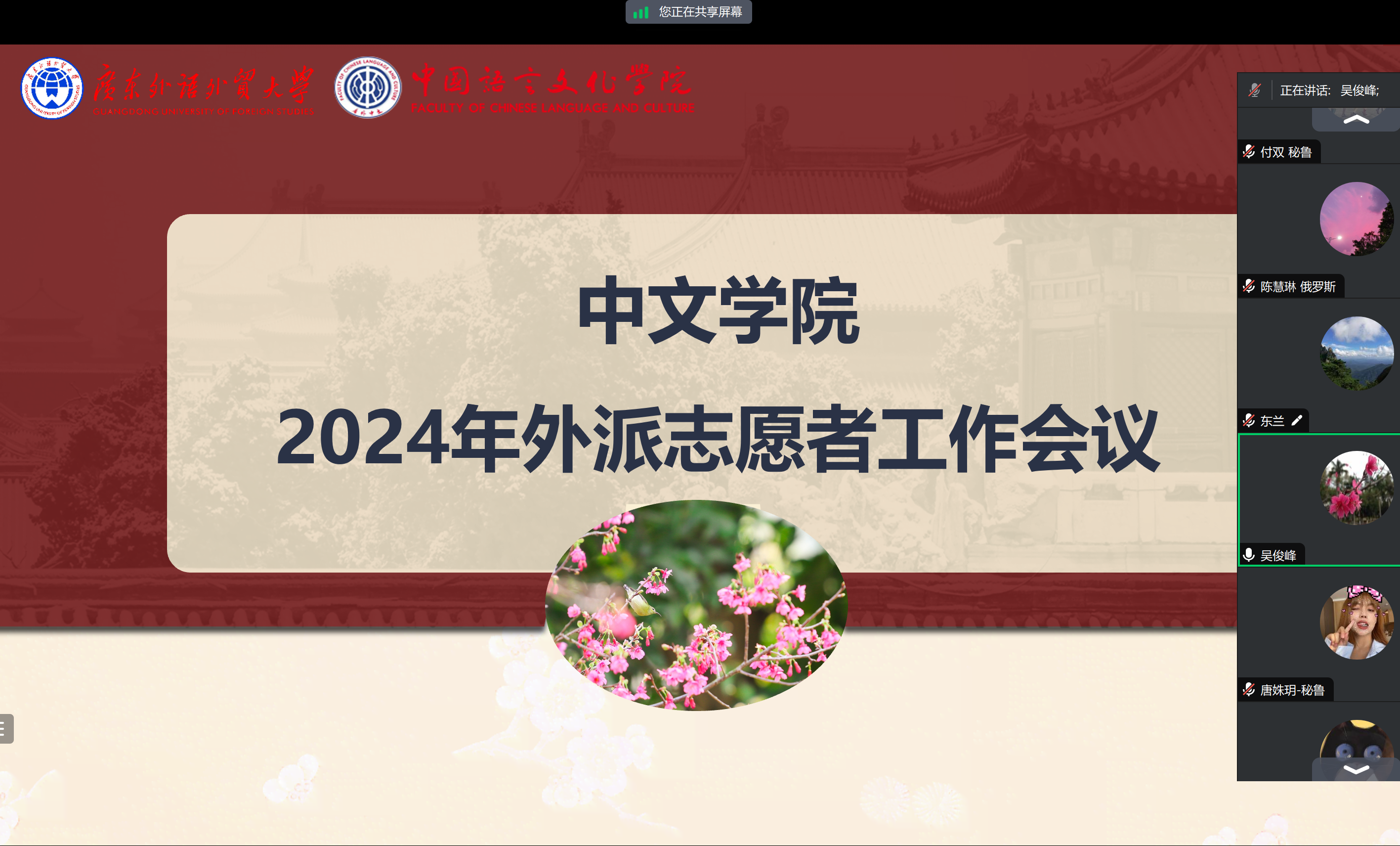 吴俊峰代表公司向坚守在海外教学一线的志愿者表达慰问和关心,感谢志愿者一年来的辛苦付出,并通报了近期公司牵头申报的国家语言文字推广基地成功获批的喜讯,表示基地的成功申报离不开孔子公司和海外志愿者提供的支持,同时嘱咐志愿者在海外要做好安全健康管理,遵守志愿者管理条例,加强沟通和理解,积极融入当地,结合当地的文化找到有效的方式传播中华文化,同时希望各位志愿者将在海外任教机会作为自己人生成长的平台,加强自身中文教学能力,学习当地好的教学理念和先进思想,为成长一个优秀的中文教学者和文化推广者奠定基础。
