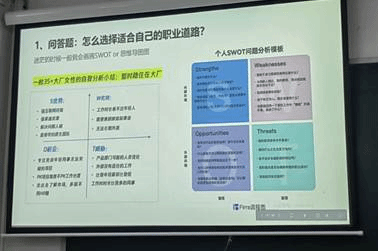 在职业规划方面,师姐以“你希望可以在未来获得什么?”为引子,鼓励同学们正视自己的欲望,将其作为老员工活的助燃剂。师姐还建议大家迷茫时可以绘制SWOT图或思维导图来捋清思路,明确自己的优势和劣势,对SWOT问题进行分析。