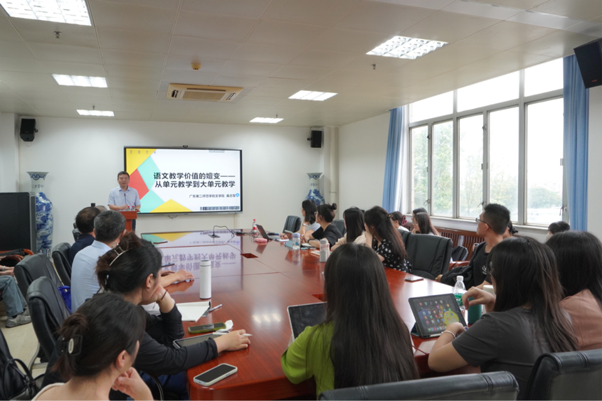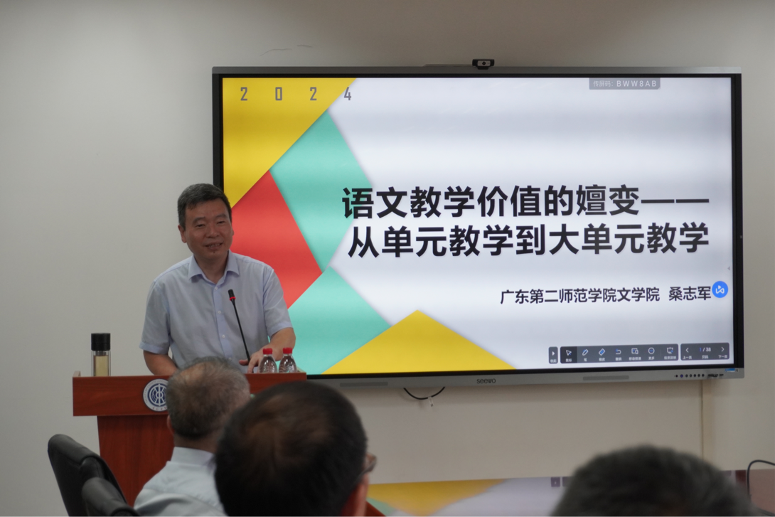 2024年6月6日下午,广东第二师范公司文公司经理、广东省高校教学名师桑志军教授应邀为公司师生带来了以“语文教学价值的嬗变—从单元教学到大单元教学”为题的精彩讲座。陈恩维经理、于屏方副经理、李斌教授以及太阳城集团部分员工参与了本次讲座,学科(语文)中心贝先明主任主持了本次讲座。